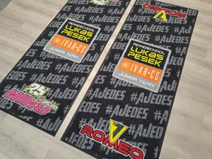 We produce original carpets under your motorbike, to present your racing team, for motorbike shows or exhibitions, for car showrooms, garages or even to your living room.